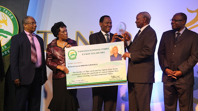 | Mgeni rasmi katika Hafla hiyo,Lazaro Nyalandu, akitunuku tuzo kwa Meja Jenerali, Mirisho Sarakikya pamoja na kitambulisho maalumu ambacho kitamuwezesha kuingia bila malipo katika hifadhi 16 za Taifa. |
